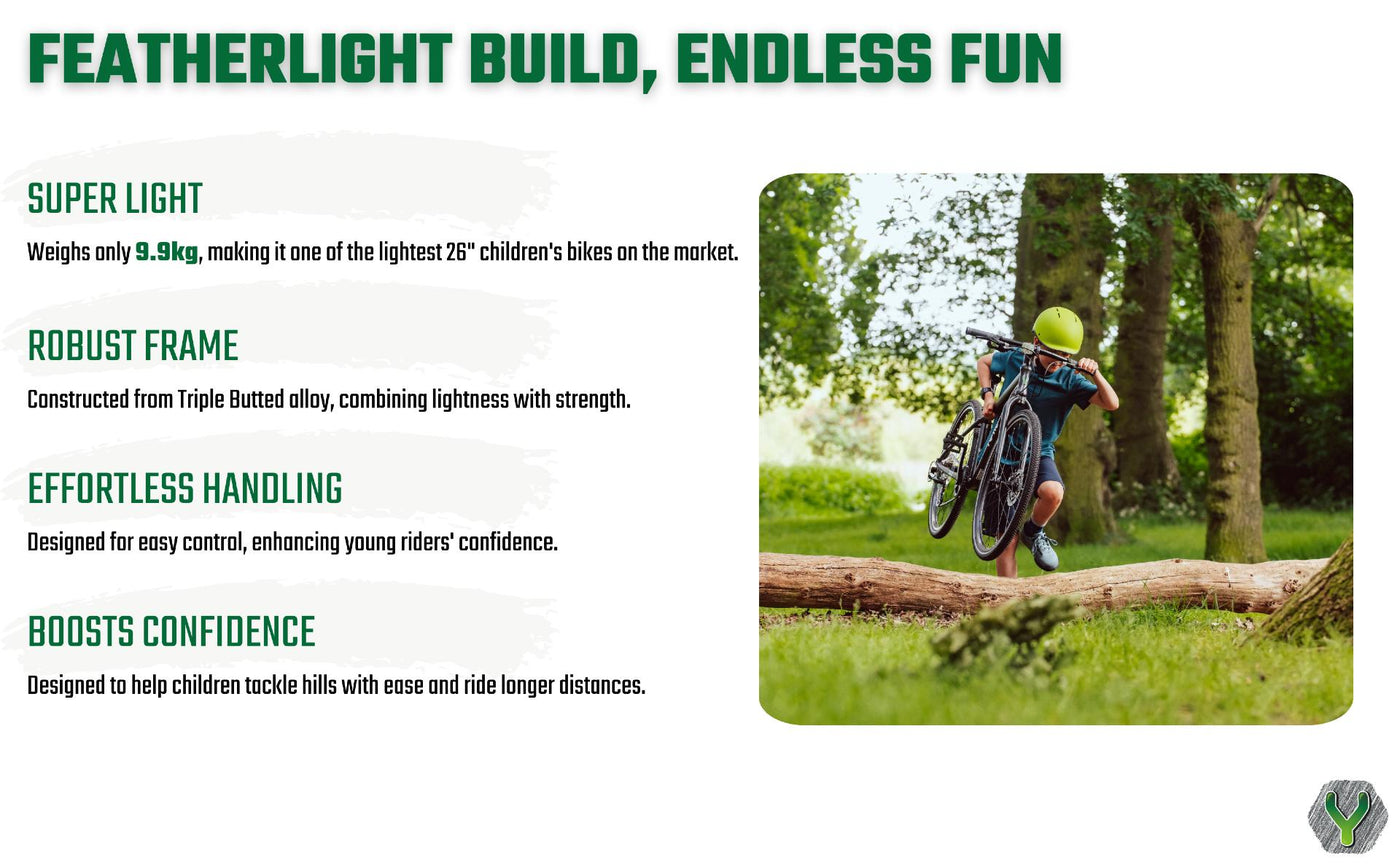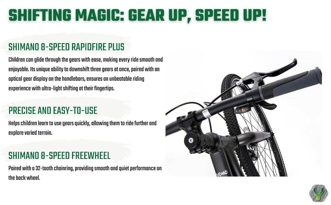 Offer your child the joy of cycling with the YOMO 26.  Boasting an ultra-light frame, reliable Shimano 8-speed gears, and trusty Tektro mechanical disc brakes, it's a dream for young riders and opens a new chapter on longer bike rides with friends and family.