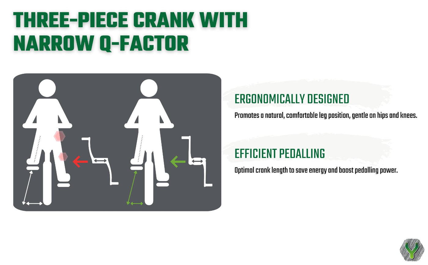 Optimised Q-factor ensures an ergonomic leg position, reducing strain on younger hips and knees, for a more comfortable ride.