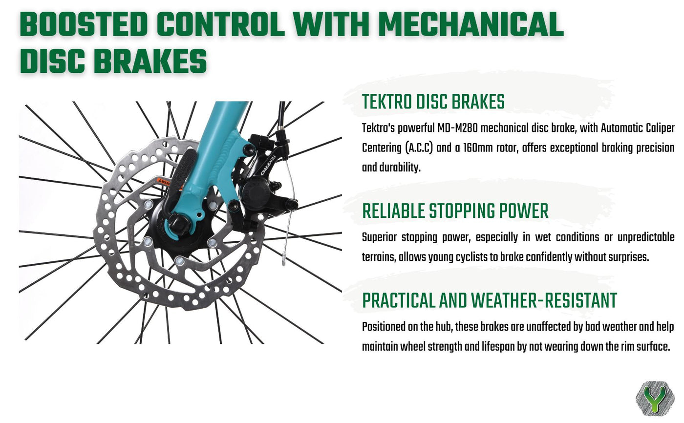 Child-specific Tektro alloy brake levers, matched to Tektro mechanical disc brakes with automatic caliper centering, ensure a confident stop with minimum effort.