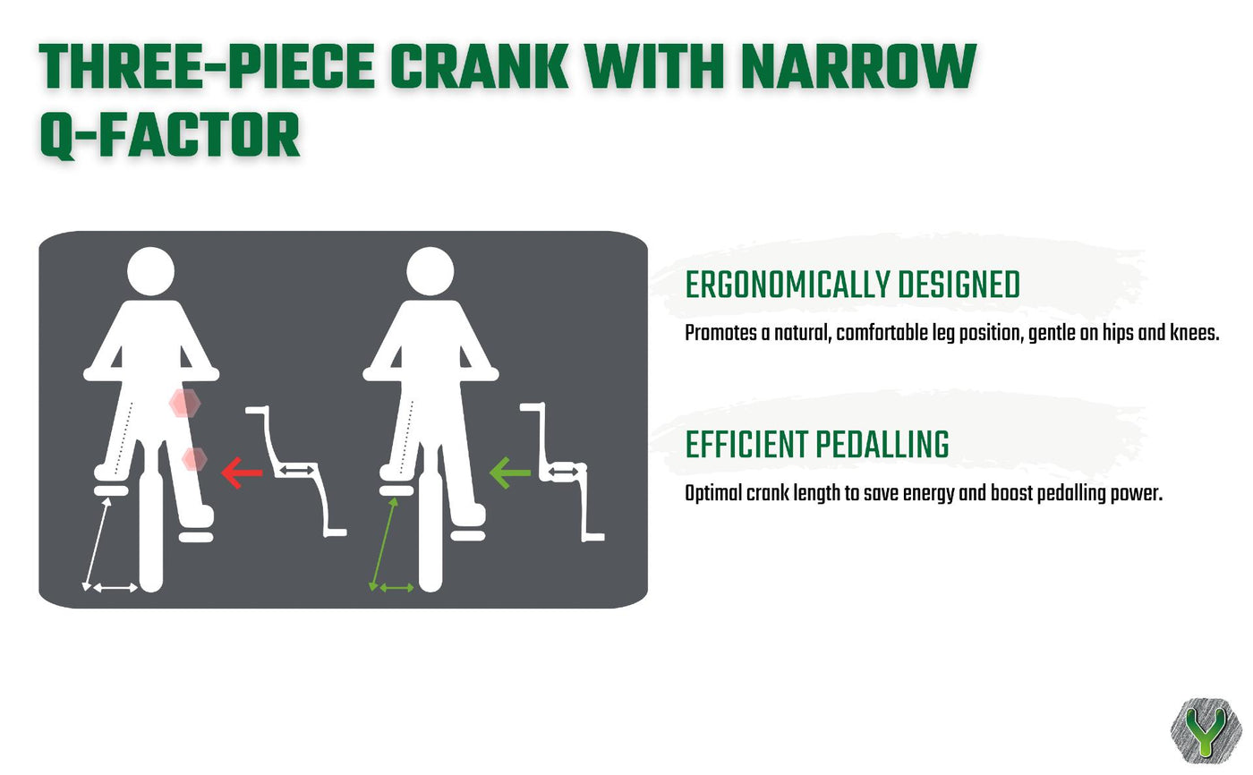 Optimised Q-factor ensures an ergonomic leg position, reducing strain on young hips and knees, for a more comfortable ride.