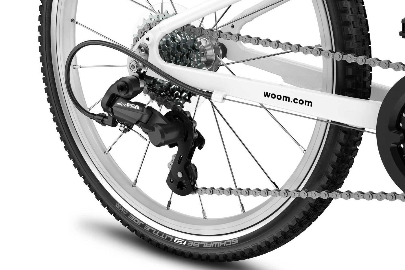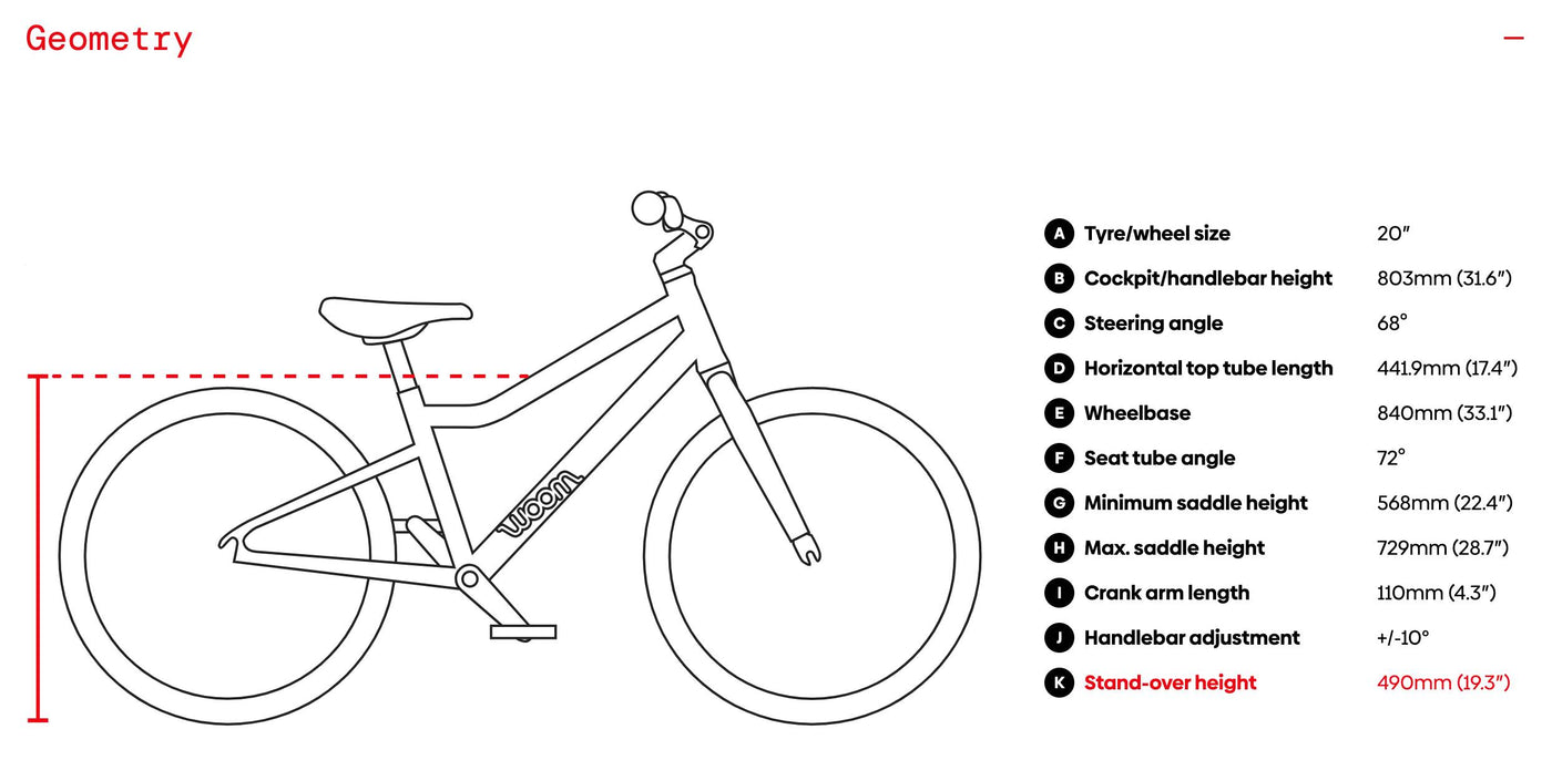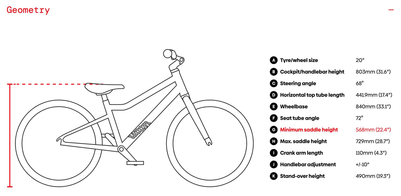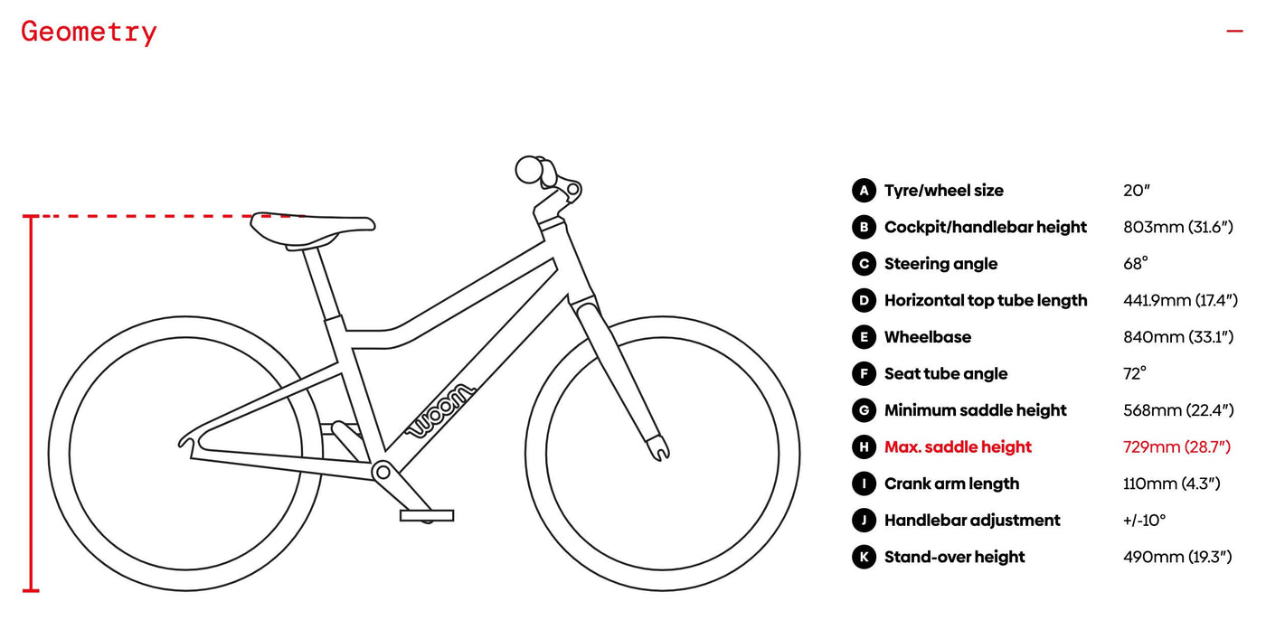 - Chainset: Woom 28T narrow-wide chainring / Woom forged 110mm alloy crank arms / Small-pitch Q-factor