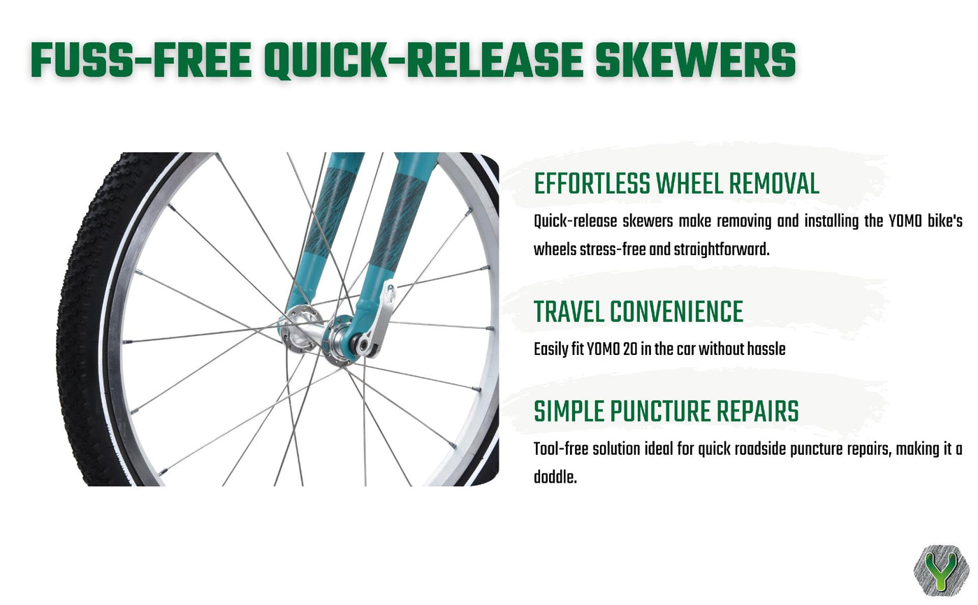 The YOMO 20 comes equipped with a full Shimano 7-speed gear system, including a Shimano Tourney super-short cage rear derailleur, a Shimano RapidFire Plus shifter, and a Shimano wide-ratio 7-speed Hyperglide cassette.
